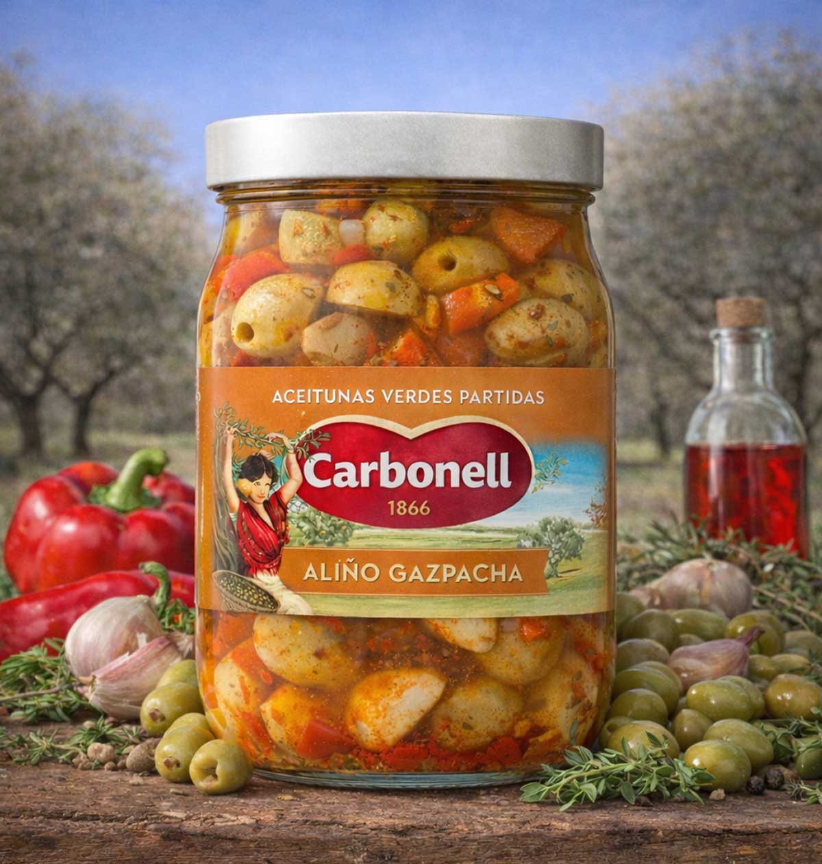 Masz ochotę na szybki, wyrazisty smak bez kombinowania? Carbonell Aliño Gazpacha to oliwki zielone w warzywnej marynacie inspirowanej gazpacho: z czosnkiem, octem i delikatną pikantnością. Całość ma apetyczny, naturalnie czerwonawy kolor dzięki papryce (pimentón) – dzięki temu nie tylko smakuje intensywnie, ale też świetnie wygląda na talerzu.