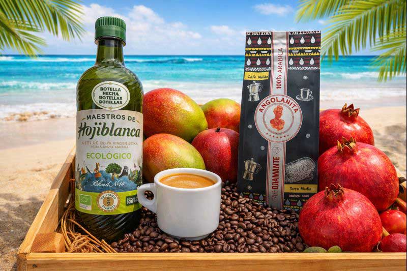 Bomba witaminowa: Oliwa Hojiblanca Eco 0,7l + kraftowa kawa z Angoli 250 g + granat (4 sztuki) + mango (3 sztuki)