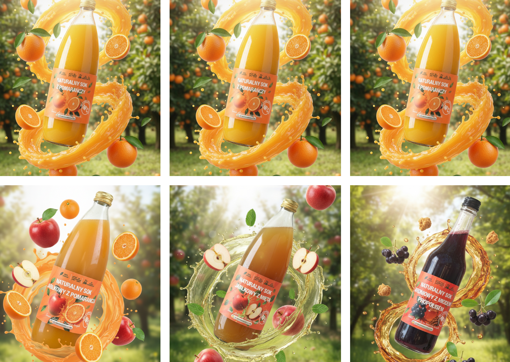 🌞 Zestaw soków NFC — 3× pomarańcz + jabłko-mięta + aronia-propolis + jabłko-pomarańcze