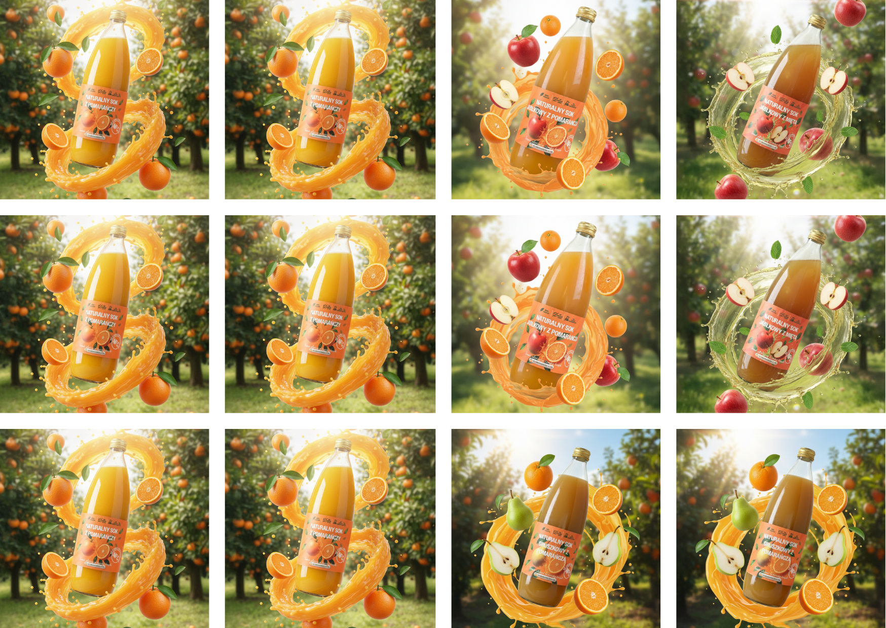 🌞 Zestaw soków NFC — 6× pomarańcza + 2× jabłko-pomarańcza + 2× jabłko-mięta + 2× gruszka-pomarańcza