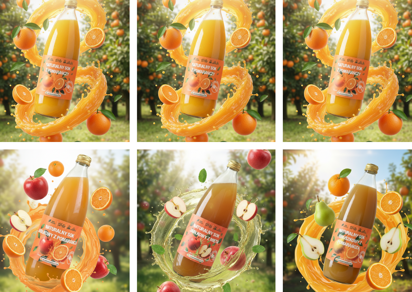 🌞 Zestaw soków NFC — 3× pomarańcza + jabłko-mięta + gruszka-pomarańcza + jabłko-pomarańcza