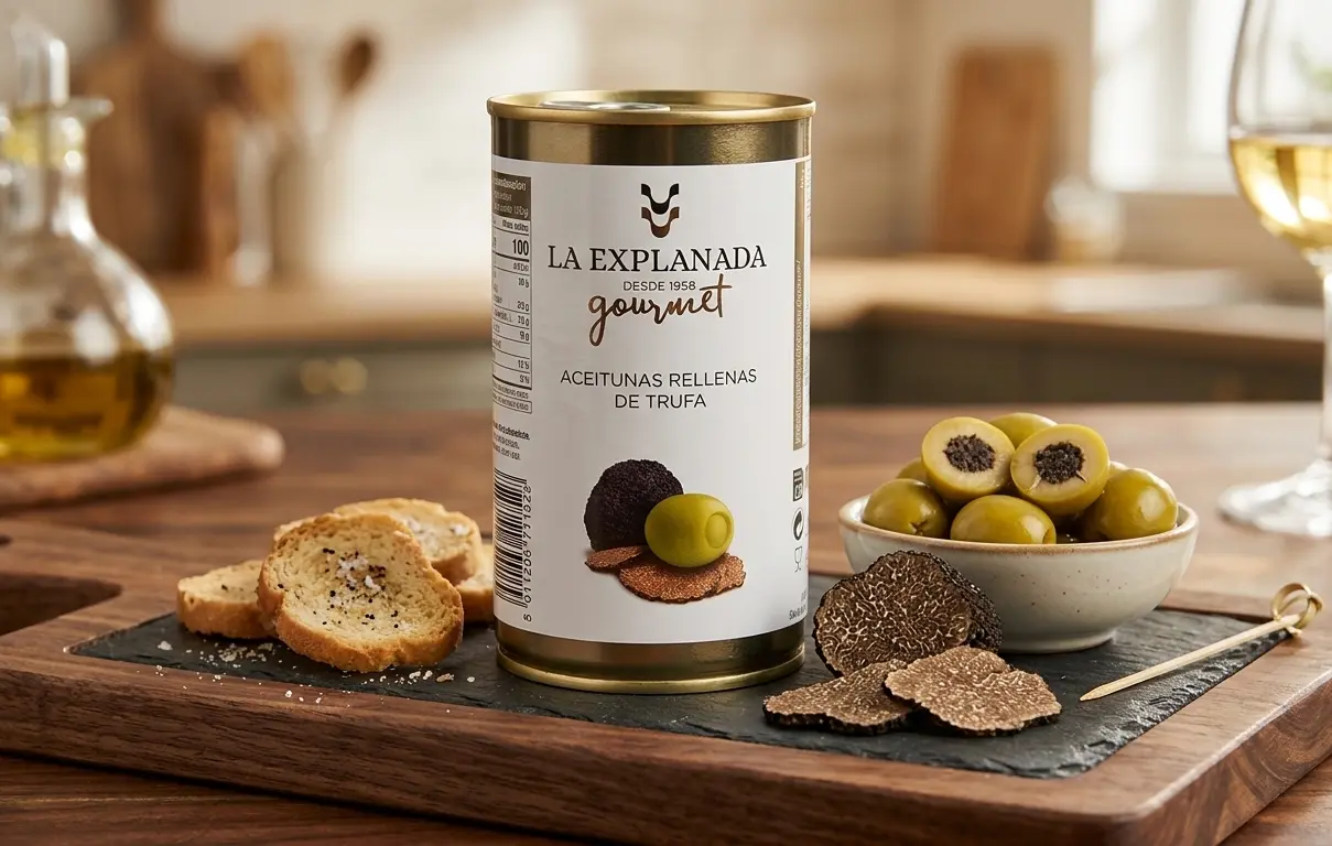 Zielone oliwki Manzanilla faszerowane pastą z czarnej trufli – wyjątkowe połączenie śródziemnomorskiej świeżości z luksusowym aromatem trufli. To elegancka przekąska o głębokim, wyrafinowanym smaku, idealna do sałatek, serów i tapas.zi